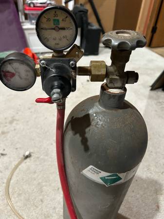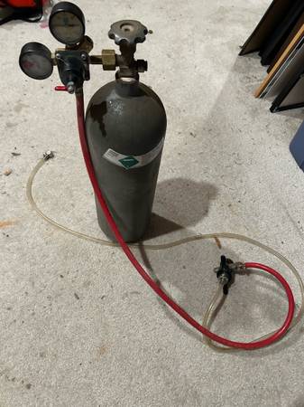 3/4 filled CO2 tank with functioning regulator and keg tap.