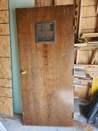 4 – doors (same dimensions) (4) white (1) stained dark. All have 10 in. square window and a 20 min. blue fire rating tag.