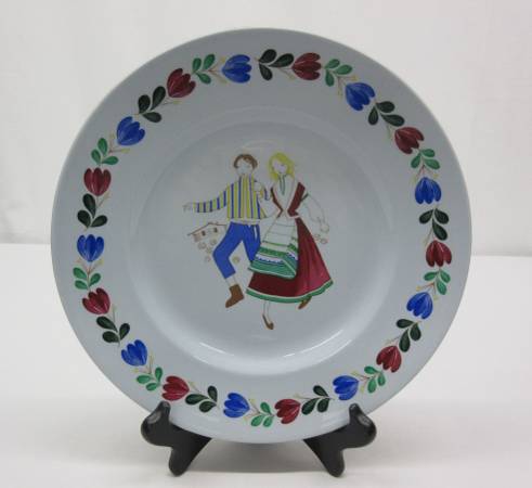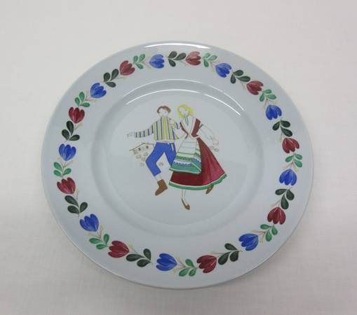 This vintage 1960's-70's, "Traditional Costumes", Arabia of Finland plate is not often found. On the center of the plate, it features two figures wearing traditional dress encircled by traditional tole style painting on the rim. The plate is 10 ¼” diameter. It is numbered “68” and “152” on the back.