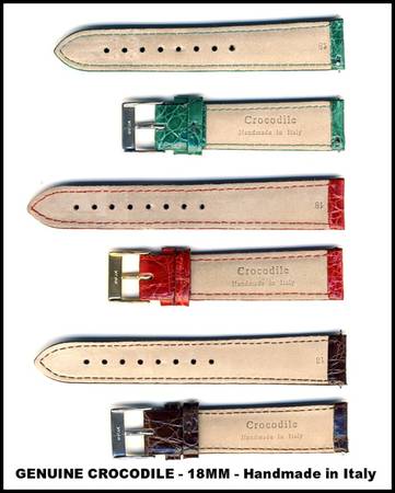 FOR SALE - NEW - Genuine Crocodile 18mm watch straps - I got these some years ago as partial payment for building a website for the importer.....I should have gotten a LOT more!! $40.00 each OR ALL 3 for $100.00 - Or maybe trade for LARGE mans watch?? Feel free to ask questions - SERIOUS inquiries ONLY.....PLEASE!!!!