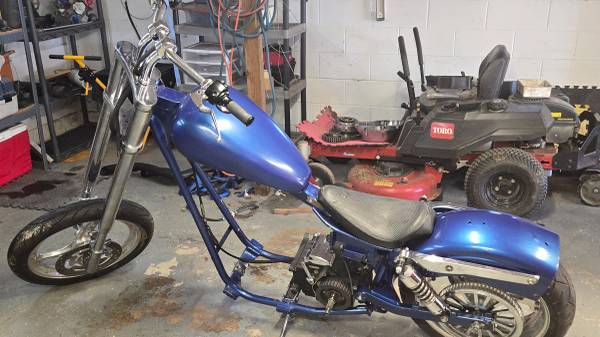 2002 dyna fxd chopped 10 over with 33°rake new front motek inverted forks 2006 6 speed transmission new wheel pulley 3 piece RC racing wheels has new bearings installed drag handle bars new clutch andbrake handles also new aluminum gas tank and new pingel petcock what you see is what you get