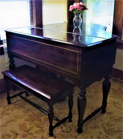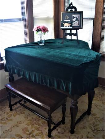 It has a Matching Bench and the seat opens to store music. Included is a Very Nice Dark Green Velvet Dust Cover.