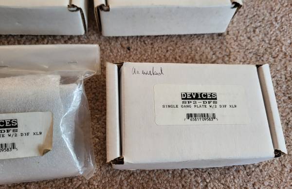 OK, we have (8) SP2-DFS stainless steel, single gang wall plates, with (2) D3F Switchcraft XLR panel mount connectors. The connectors are individually stamped 1 & 2 on plate one, are stamped 3 & 4 on plate 2, 5 & 6 on plate 3, up to 15 & 16 on plate 8.