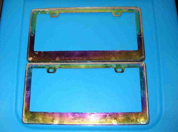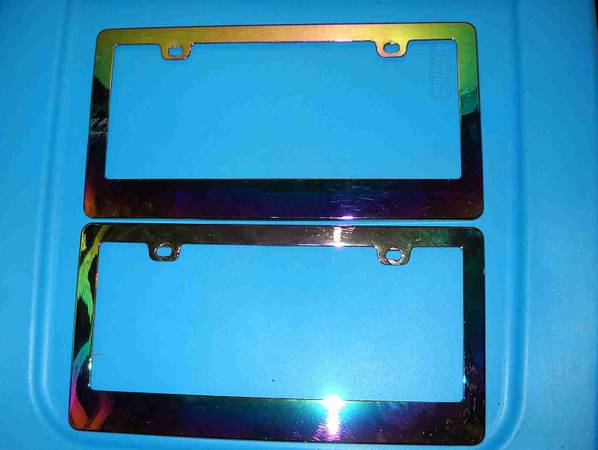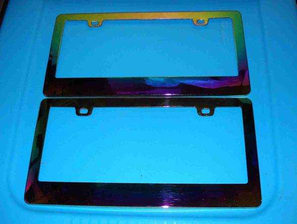 I have for sale a pair (2) of polished license plate frames. These are the kind that look like chrome in one light and have a multicolor effect in another light. They say Custom Accessories Inc on the back. One is in good condition. The other has a scrape and minor bend as you can see in the picture.