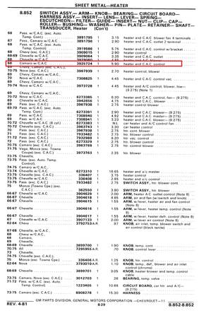 I have for sale a New Old Stock GM switch, part # 3925724. According to the GM parts book this is correct for a 1968 Camaro with air conditioning. It should be the same in a '68 Firebird as well. The box had been opened prior to my getting it, but it appears to be a brand new GM part that was left on a shelf somewhere for years.