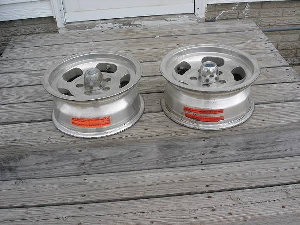 For sale; One pair of old school aluminum slots. The wheels are in good shape and have been stored inside since 1980. Lug nuts come with. $150.00 for both. CALLS ONLY. 5one5 5seven0 51eight4