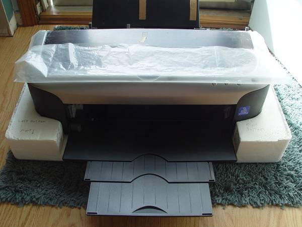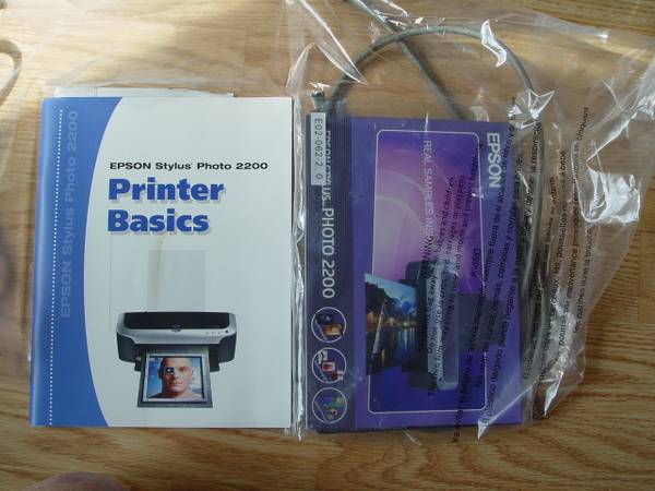 Selling my Epson Stylus Photo 2200 model. Comes with power cord, Roll Paper Cutter, Firewire Cable , Booklets shown -- Installation software is available on the Epson website.-- Yes - it still has the factory protective plastic on the top panel! Printer was always covered with a plastic sheet when not in use so yes, it looks like new.