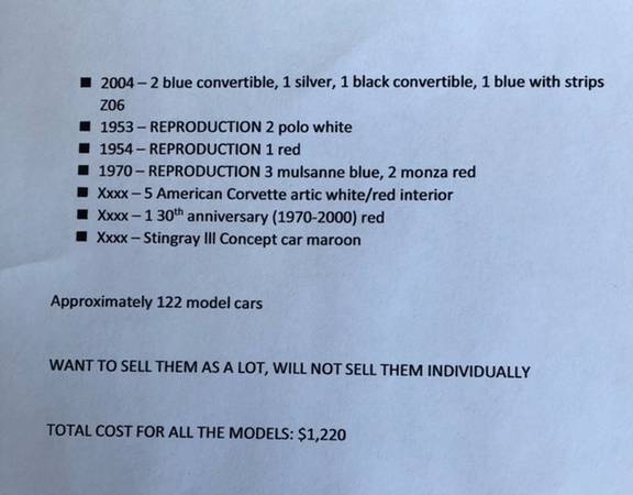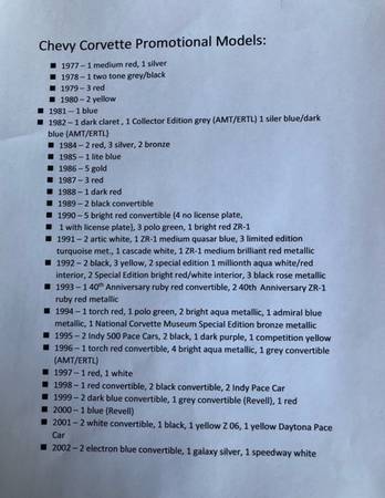 For Sale Corvette Models: Note the list of the 122 Promotional Models. They are in original boxes. Selling them as a lot, will not sell them separately. ALL 122 PROMOTIONAL MODELS FOR: $1,220 CALL:...