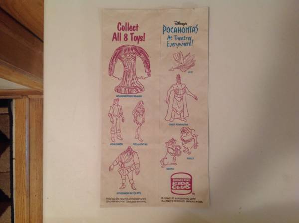 We have a set of 6 Pocahontas hide n seek finger puppets from Burger King 1996. In original sealed bags. 2 Original Adventures magazines. $2 for the set and magazines