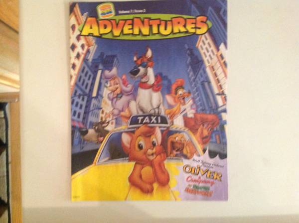 We have 3 Oliver and Company toys from Burger King, 1996. Each in original sealed packaging. Also have 3 Adventure magazines. $1 for all