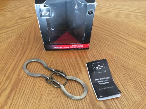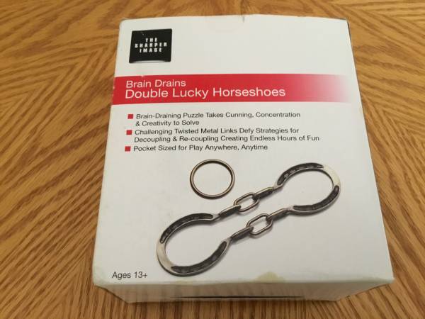 Sharper Image Brain Drains Double Horseshoes. Twisted metal links for decoupling and recoupling. Difficulty level 3. Ages 13+. Puzzle in excellent condition and original box very good condition. $2