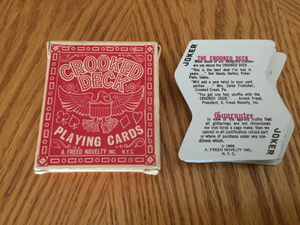 Vintage, original crooked deck playing cards, A. Freed Novelty Inc. NYC. Copyright 1969, see pictures. Complete deck of 52 cards plus 2 jokers. Cards in excellent condition, no tears or creases. Original box with slight wear on corners.