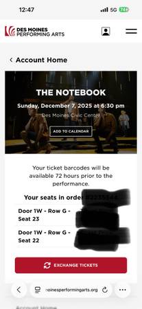 Ticket codes will become available 72 hours before the show, tickets are going for way more than this price now. I just need to get these gone as they remind me of a failed relationship, and I’m moving away. I will transfer main email to you immediately upon purchase. These are great seats, I just no longer need them or will use them. If you can give me a reasonable price I will take it, but they’re 350 before Tax right now through DMFA studio, Venmo, Apple Pay, Cashapp, and also in person cash, I will transfer code immediately, no scam. Just won’t use these