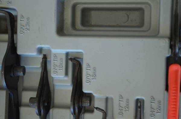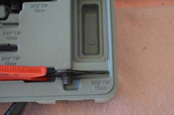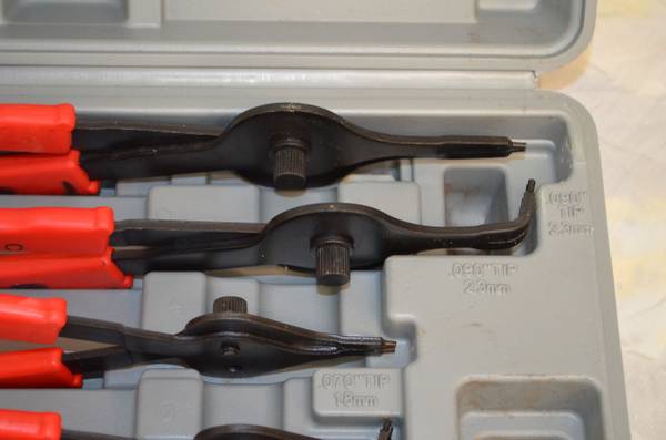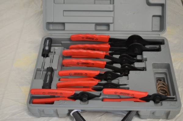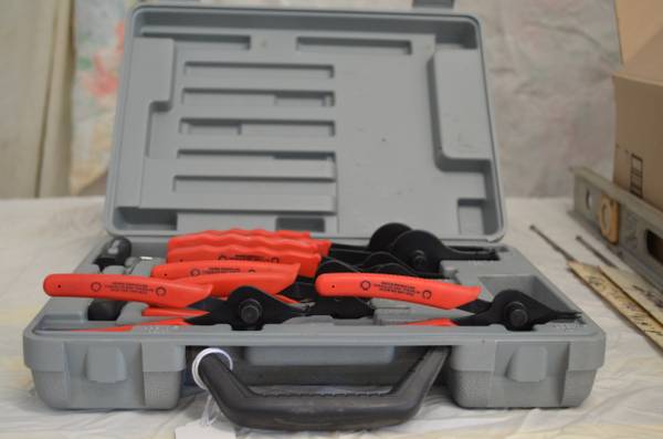 Hardly used snap ring plier set in carrying case. Several different sized tips. Works awesome for inside and outside snap rings. No need to change tips that get easily lost. Includes straight and...