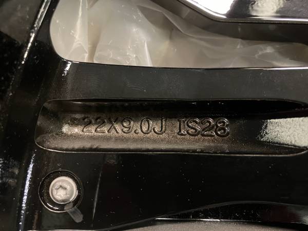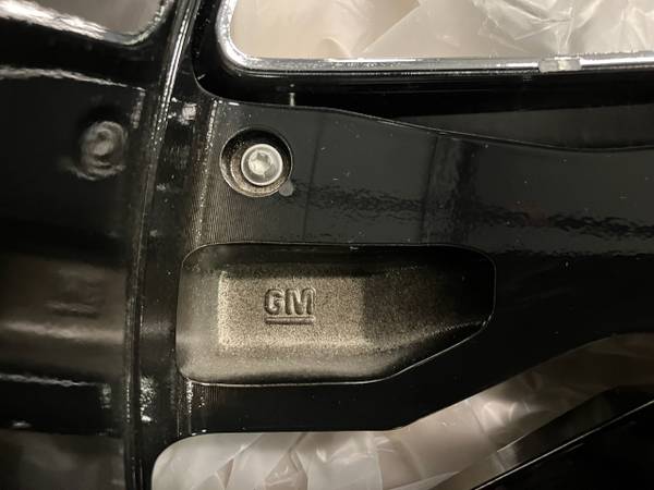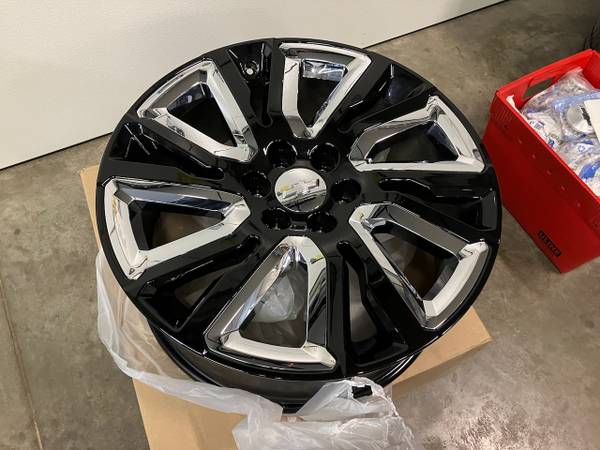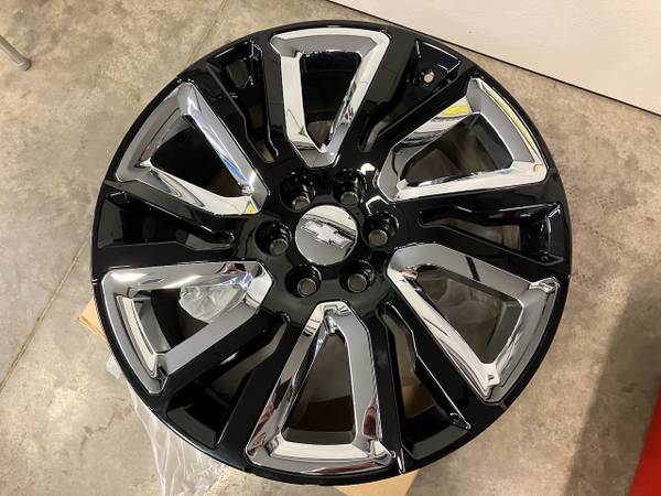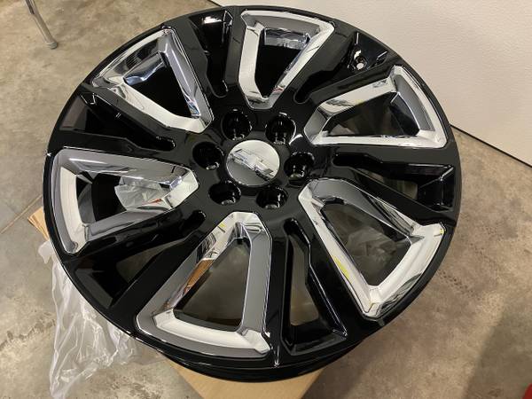 New GM Accessory 22 x 9" wheel in black with chrome accents. This was a display piece that was never bolted to a vehicle and hasn't had a tire mounted on it. Overall, it's a very nice wheel and tire if you need one. Chrome Chevy center cap included.