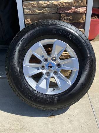 For sale: Take off 17" factory GM wheels and tires. These came from a new GMC Sierra 4x4 and were removed, at the dealer for an upgrade 20" set. The wheels are an aluminum alloy with oem General Grabber HTS tires size 255/70/17. Manufacture mould marks are still visible, complete full tread. The set comes with center caps and tire pressure sensors. Due to having Chevy caps in hand it is your choice which you would like installed, see pictures. These will fit Chevy/GMC trucks and full size SUV (Tahoe/Yukon) with a 6 bolt pattern from 1988 thru 2025. Also these will fit the new style Chevy Colorado/GMC Canyon 2023-2025. This will make a great upgrade set, replacement set, or winter set. Asking $1200 or best offer. Call or Text Jeremy at (515) 5 1 4 - 4 7 9 1.