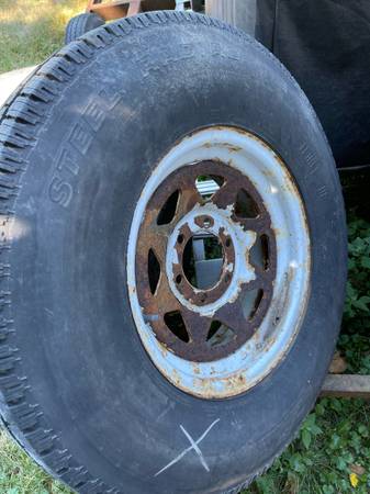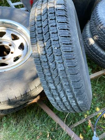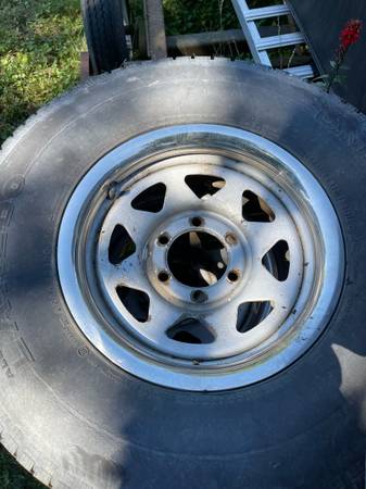 6 bolt 16 inch trailers wheels. 4 are grey with chrome beauty rings and the other is white. Came off a fifth wheel camper but will work on any trailer. All hold air but are weather checked.